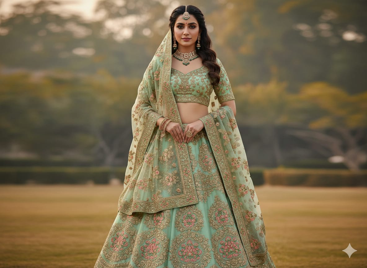 Summer Green Lehenga – crafted with elegant embroidery and fine detailing for weddings and festive occasions.